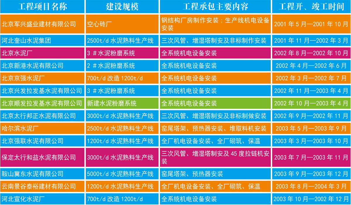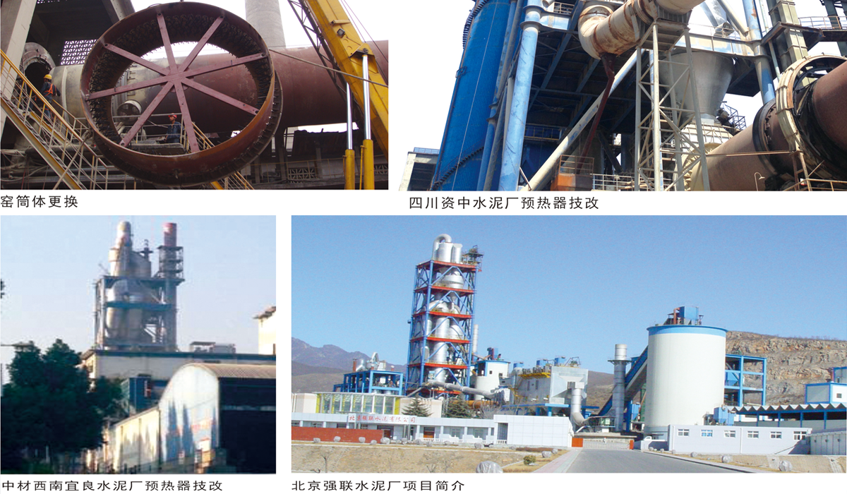 我公司每年為十幾個(gè)水泥廠(chǎng)提供大修改造服務(wù),主要內(nèi)容有∶ 窯系統(tǒng)換民,預(yù)熱器更換澆筑料窯托輪更換軸承瓦,更換窯口鐵,更換筒體; 磨機(jī)更換襯板,銅壓機(jī)更換銀套,立磨更換襯板及輾套; 破碎機(jī)更換襯板及錘頭,堆取料機(jī)更換鏈條及刮板; 全廠(chǎng)電機(jī)檢查,其他附機(jī)設(shè)備檢修; 其他甲方要求的項(xiàng)目。